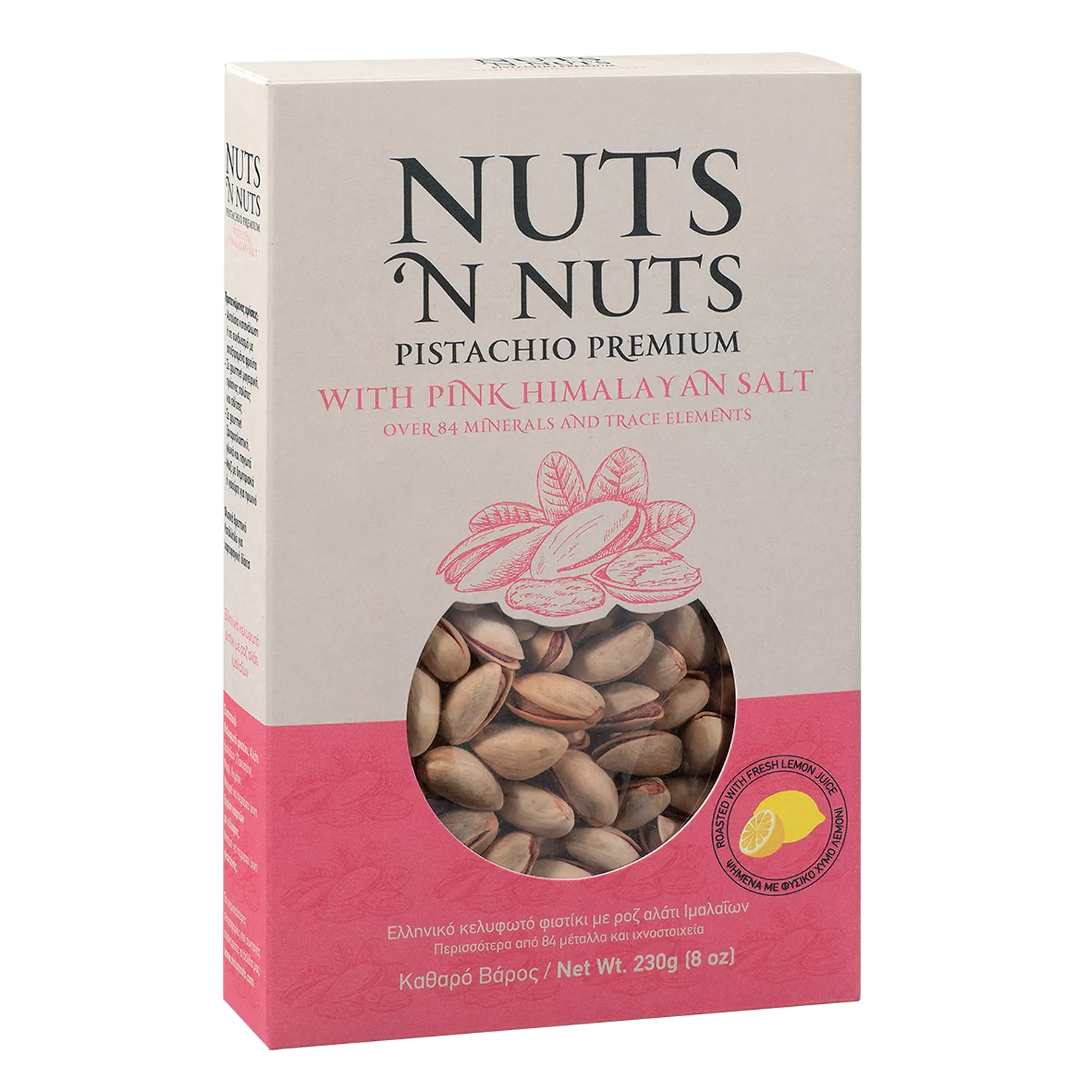 Τα φιστίκια Nuts n’ Nuts συλλέγονται με αφοσίωση και προσοχή από κτήματα οικογενειακής καλλιέργειας στην Ελλάδα και ψήνονται προσεκτικά για να αποκτήσουν την ξεχωριστή τραγανή υφή τους. Οι πινελιές που κάνουν την διαφορά είναι το φίνο ροζ αλάτι Ιμαλαΐων που δίνει την σπιρτάδα του και η φυσική φρεσκάδα λεμονιού που απογειώνει την γεύση.