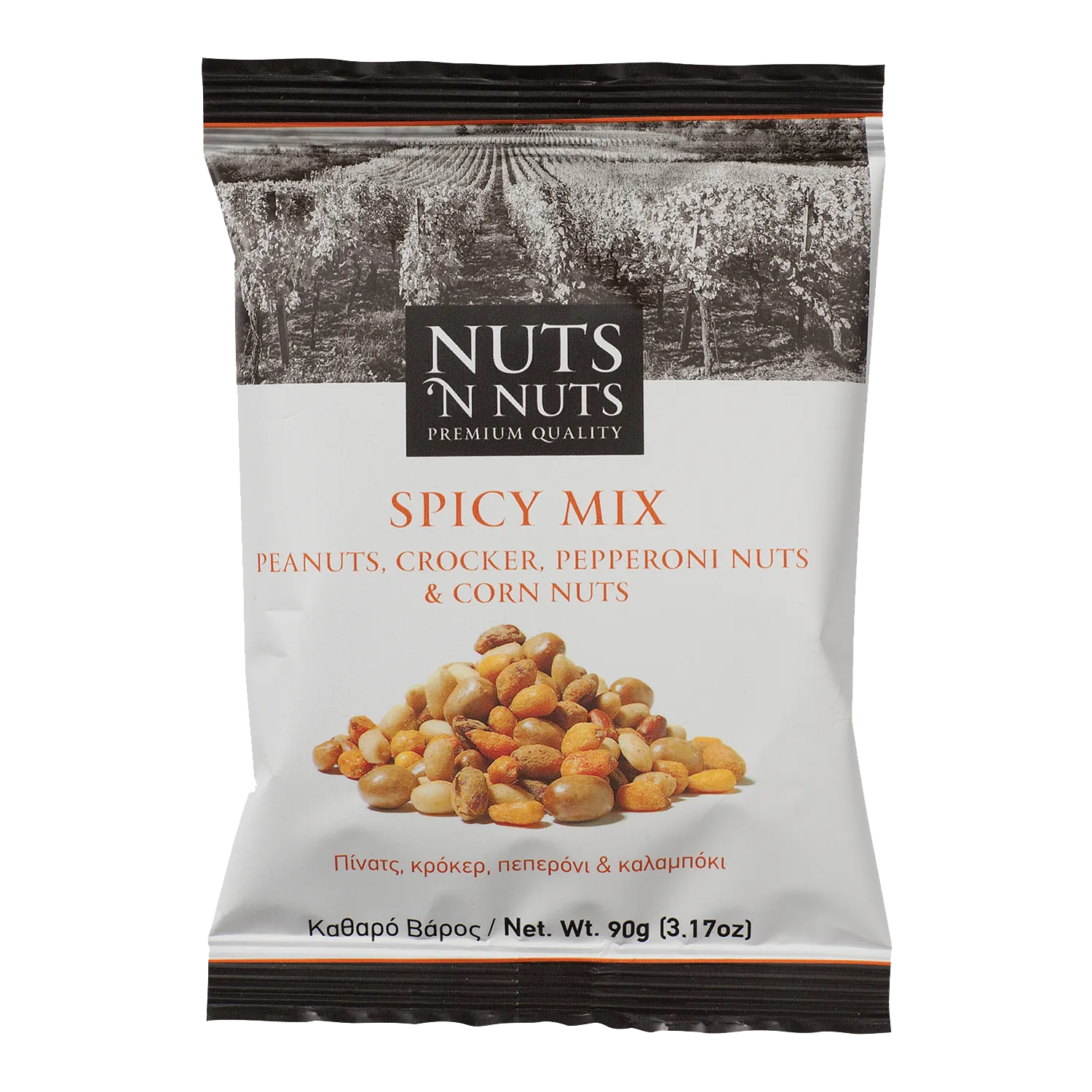 Ανακαλύψτε το premium Spicy Mix της Nuts n’ Nuts, έναν εκρηκτικό συνδυασμό από τραγανά πίνατς, κροκάν σνακ, καλαμπόκι και πικάντικο πεπερόνι.